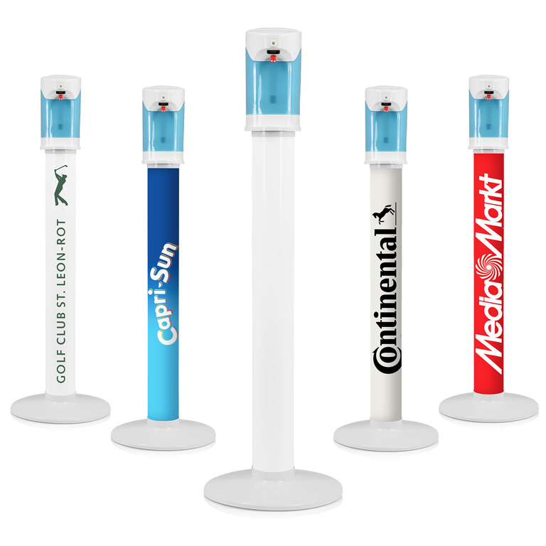 Ja! Der Standfuß ist individuell gestaltbar. Die Farbe des Desinfektionsbehälters kann ab einer bestimmten Abnahmemenge auch individualisiert werden.