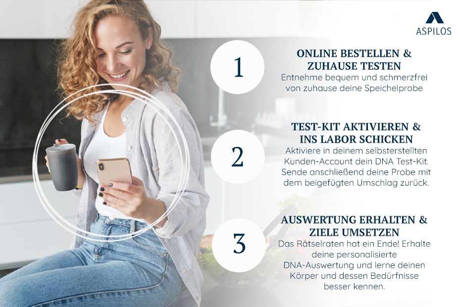 - Persönliche Auswertung & personalisierte Handlungsempfehlungen: Sie erhalten eine detaillierte Auswertung Ihrer genetischen Ergebnisse sowie spezifische Handlungsempfehlungen und Tipps zur Optimierung von Ernährung und Lebensstil in Ihrem Nutzerkonto. Dabei müssen Sie sich keine Sorgen machen, Ihre Daten sind bei uns sicher und werden nicht an Dritte weitergegeben.